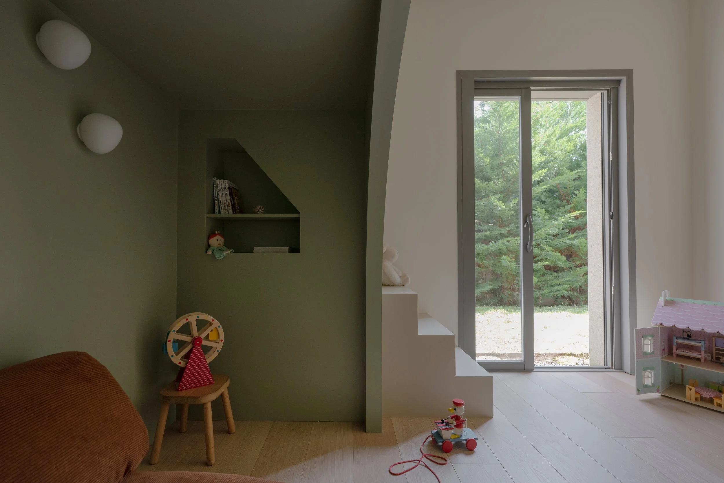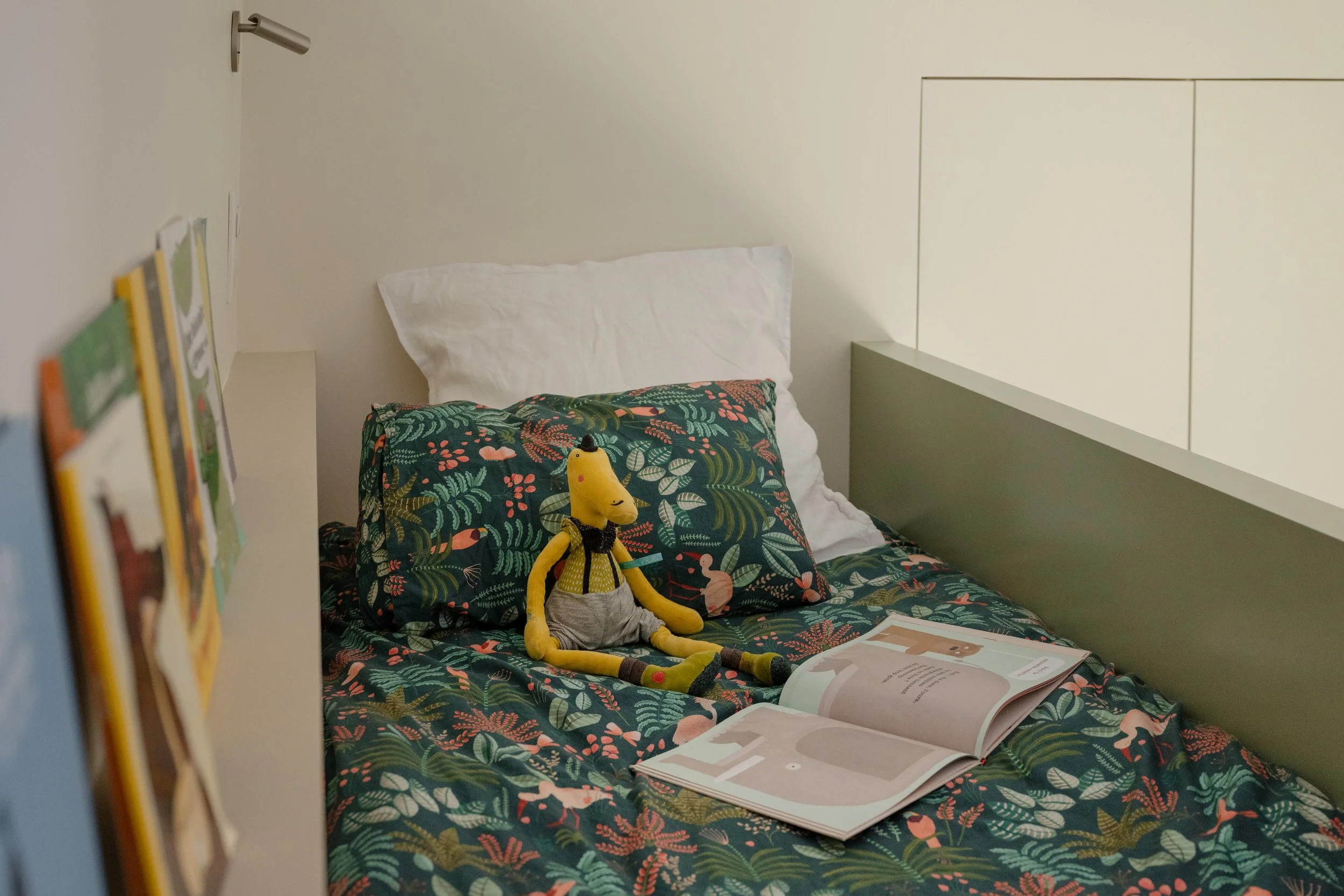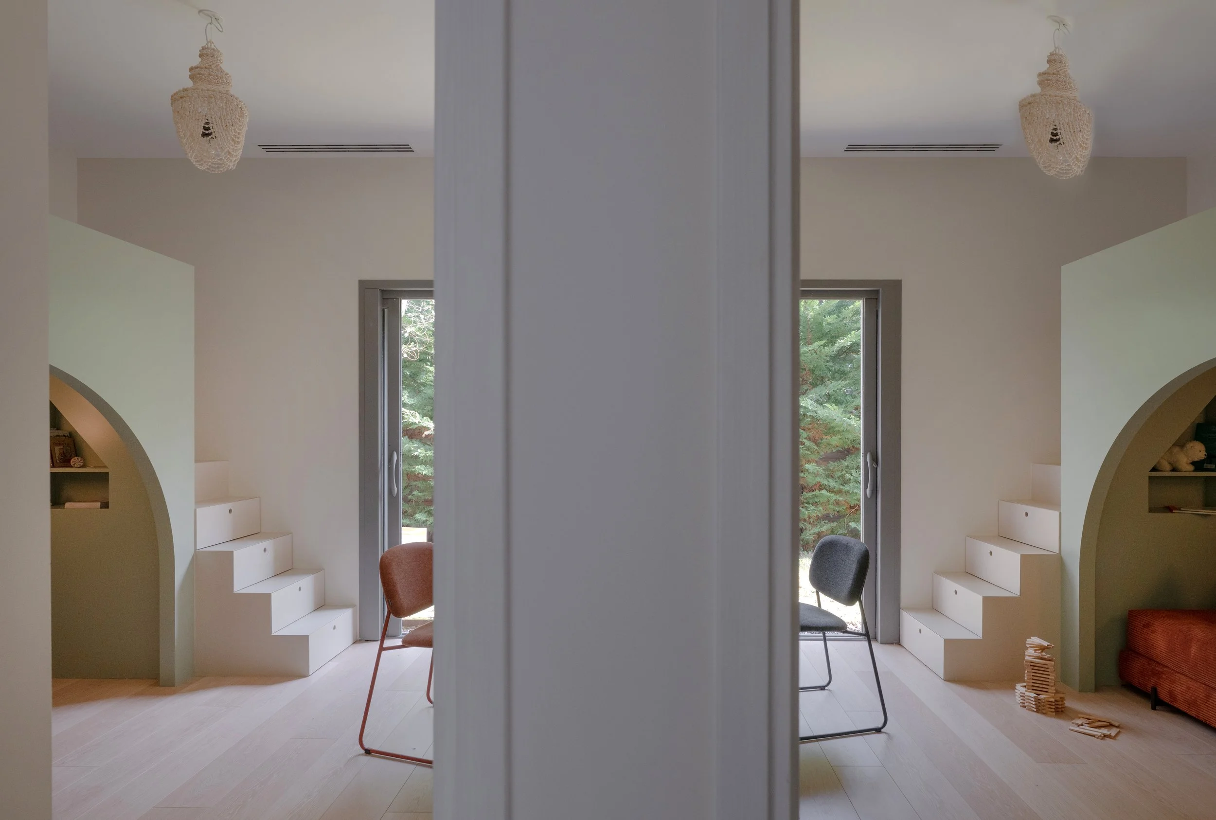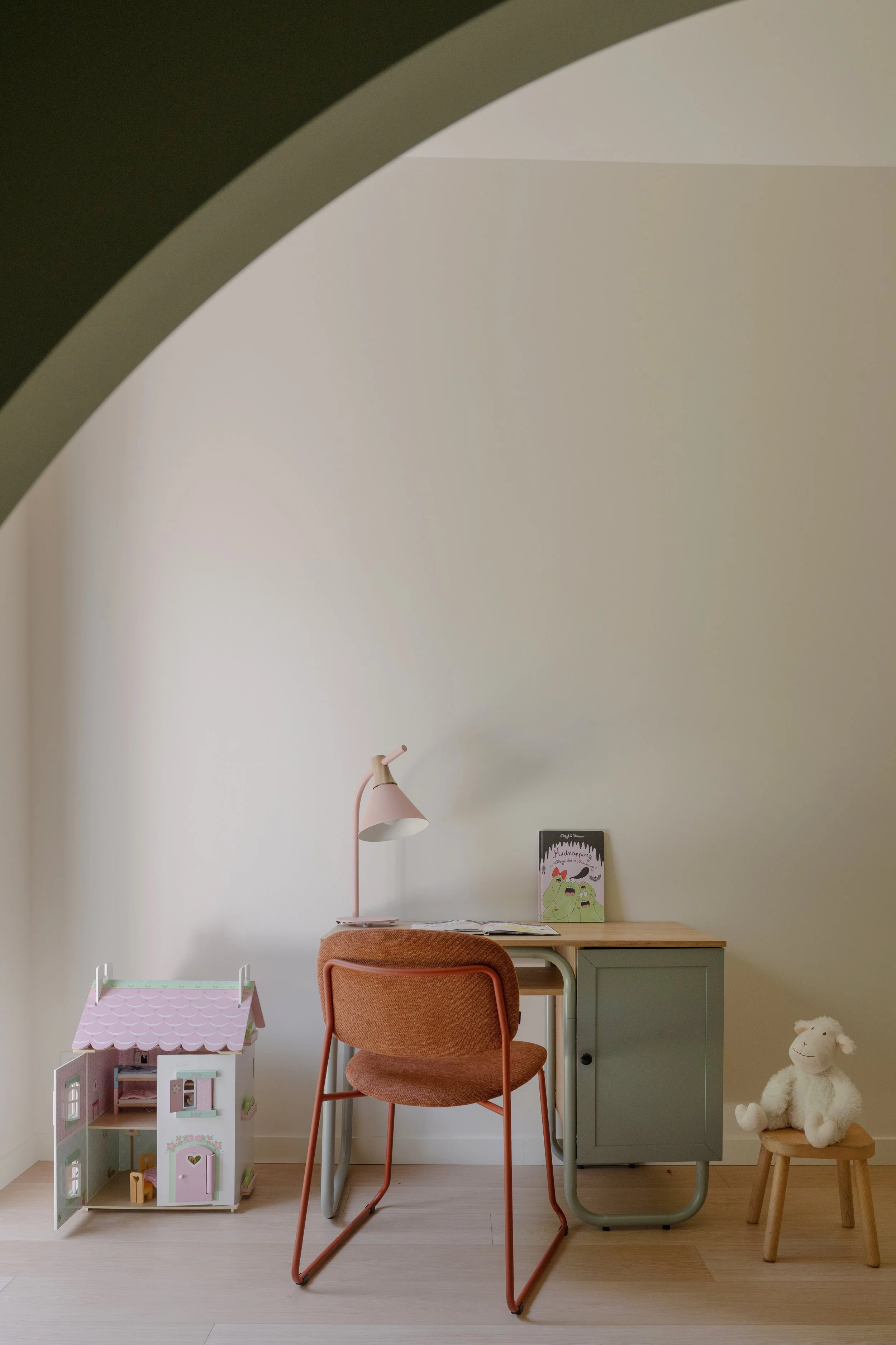 Jusqu'à présent, les deux filles dormaient ensemble. Pas par contrainte, mais parce que rien n'avait encore été pensé autrement. Leurs parents voulaient leur offrir à chacune un espace bien à elle — un endroit où grandir, rêver, inviter ses amies — sans pour autant sacrifier l'espace de jeu au sol, si précieux dans une chambre d'enfant. Et les deux filles avaient une exigence très claire : elles voulaient la même chambre.Deux pièces, deux sœurs, un programme commun. En apparence simple. En pratique, bien plus complexe.Notre approche