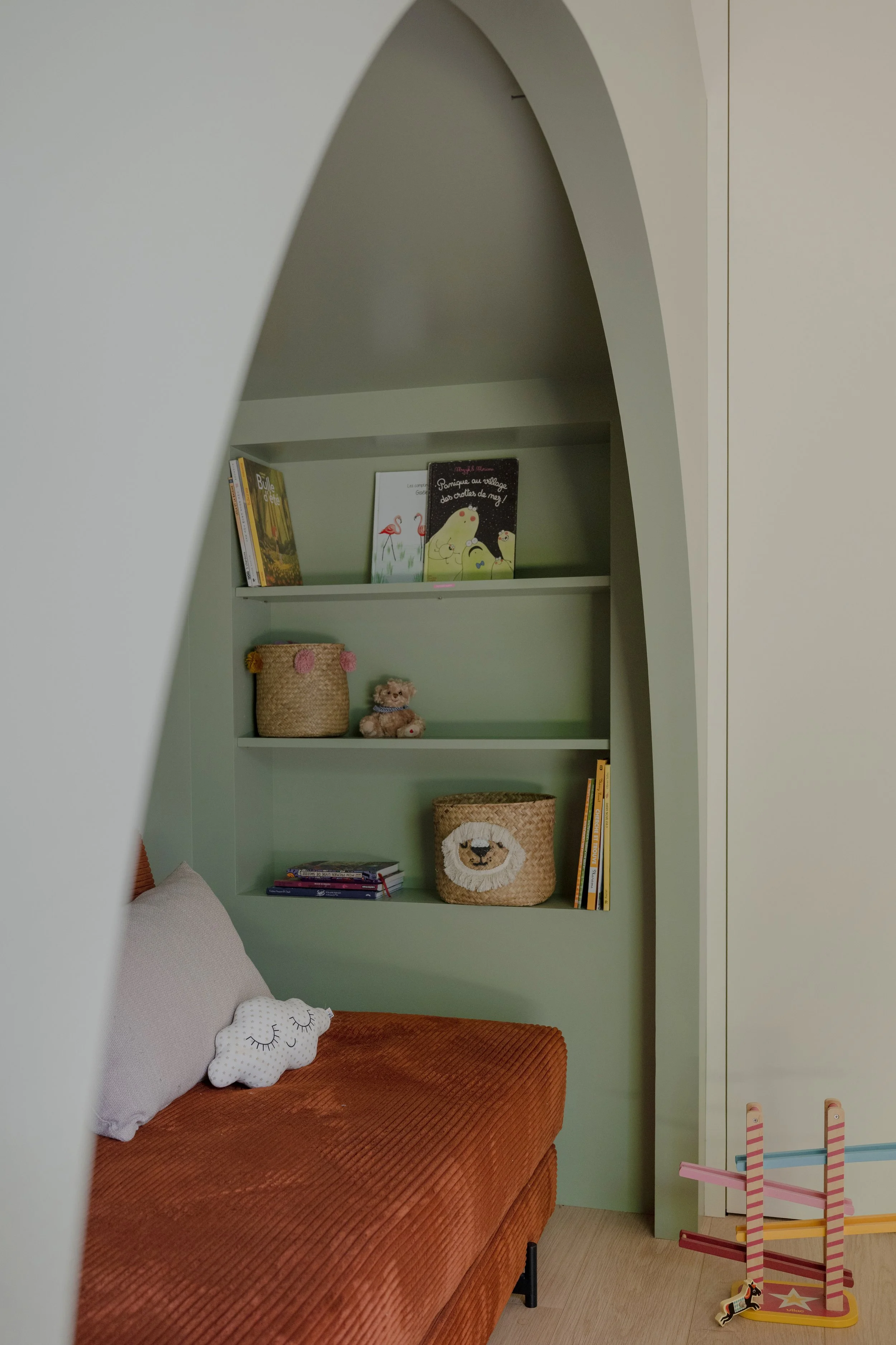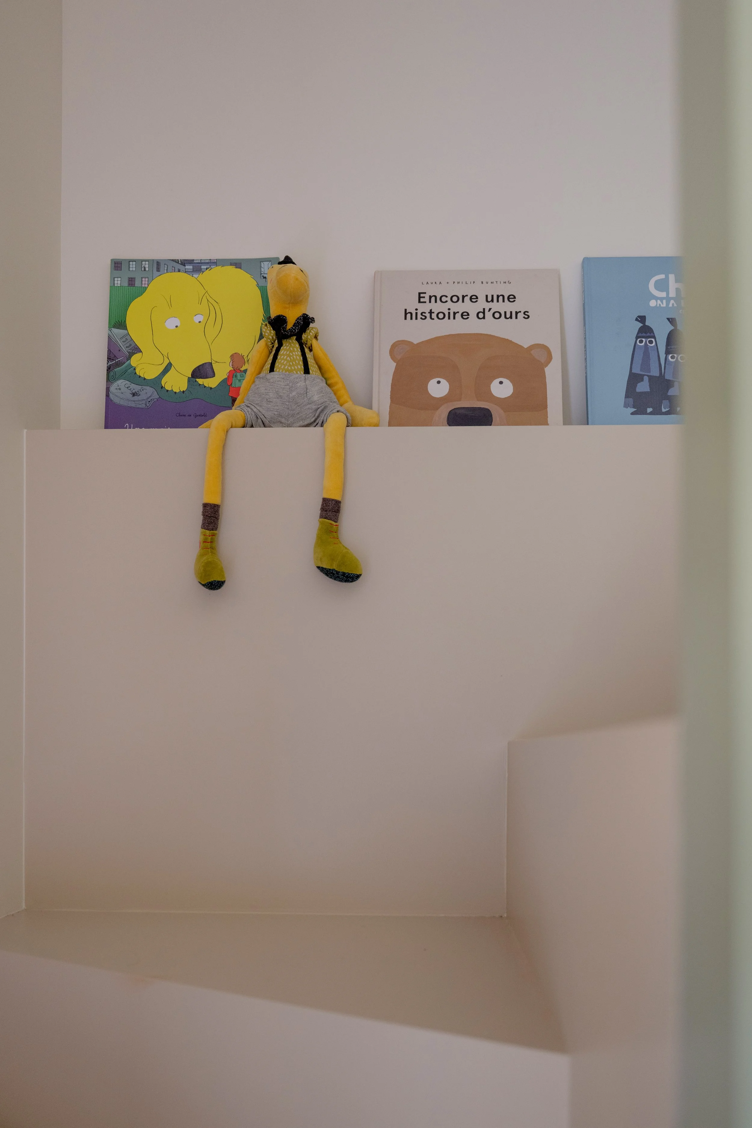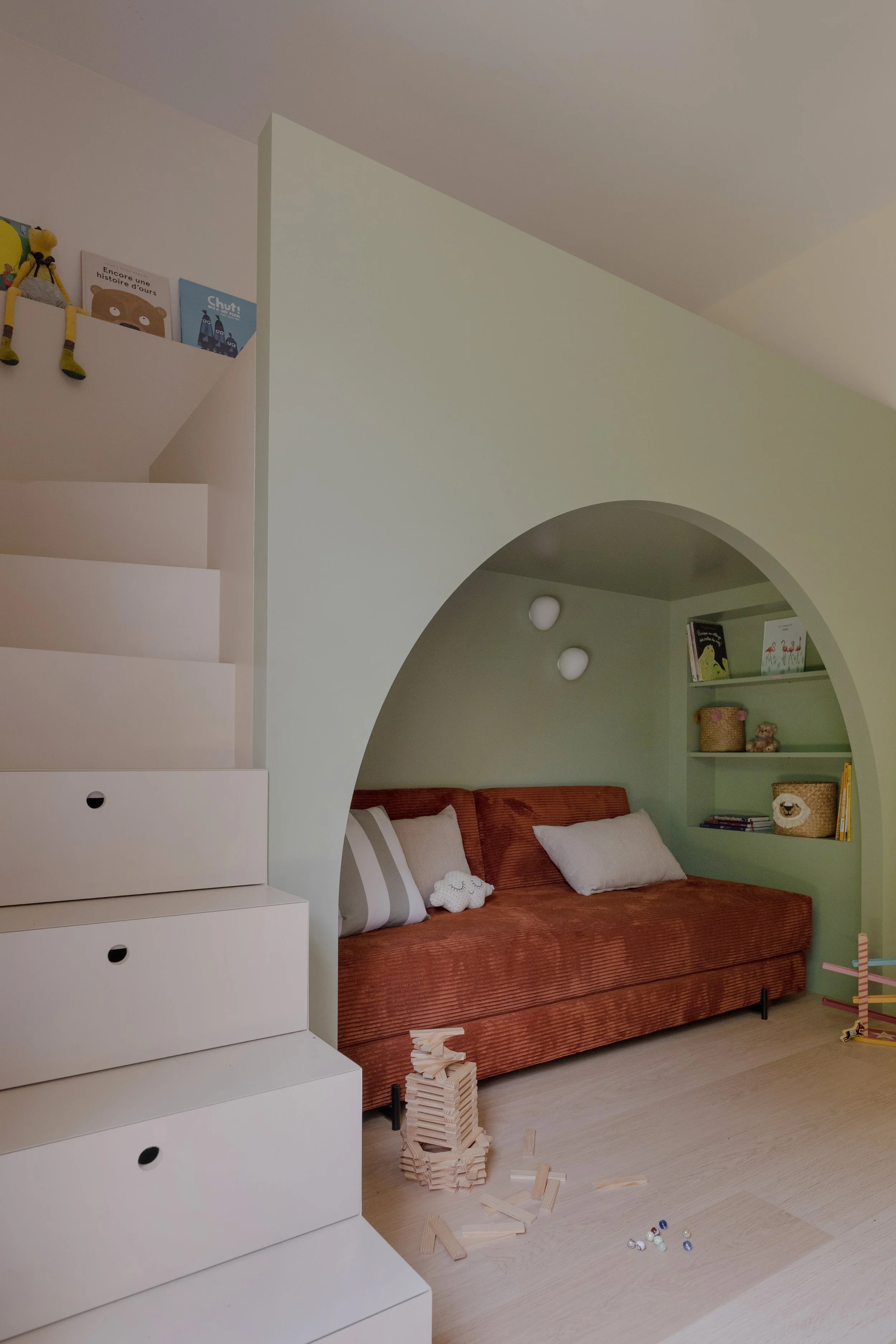 Pour créer le même aménagement dans deux pièces aux géométries différentes, l'une des chambres nécessitait une redistribution complète des cloisons. Une partie des rangements existants a migré vers le couloir attenant pour libérer l'espace nécessaire à l'installation de la mezzanine.Le lit a été conçu comme une boîte colorée dans un ton neutre, posée dans la pièce sans s'y fondre — légèrement détachée de l'environnement, presque sculpturale. L'accès n'est pas une échelle — nous avons dessiné un vrai escalier, dont chaque marche est un tiroir de rangement. Une réponse au manque de place autant qu'un geste d'architecture.L'espace sous la mezzanine a fait l'objet de longues discussions. Nous avons finalement choisi de le laisser ouvert, non meublé, laissant aux filles la liberté de l'investir selon leurs âges et leurs envies. Aujourd'hui un canapé, un lit d'appoint pour les nuits entre amies. Demain un bureau, ou autre chose. La chambre grandit avec elles.Le parti pris esthétique était posé dès le départ : ne pas tomber dans les codes enfantins. Ces mezzanines devaient pouvoir convenir à une jeune adulte. Dans dix ans, elles seront toujours bien.La plus grande satisfaction dans un projet pour des enfants, c'est leur réaction à la livraison. Ils sont les critiques les plus honnêtes qui soient — sans filtre, sans ménagement. Ici, elles se sont approprié l'espace immédiatement. Elles dorment chacune dans leur chambre. Et de temps en temps, l'une rejoint l'autre sous la mezzanine.C'est exactement ce qu'on espérait.Crédits photo — © Sabine Serrad