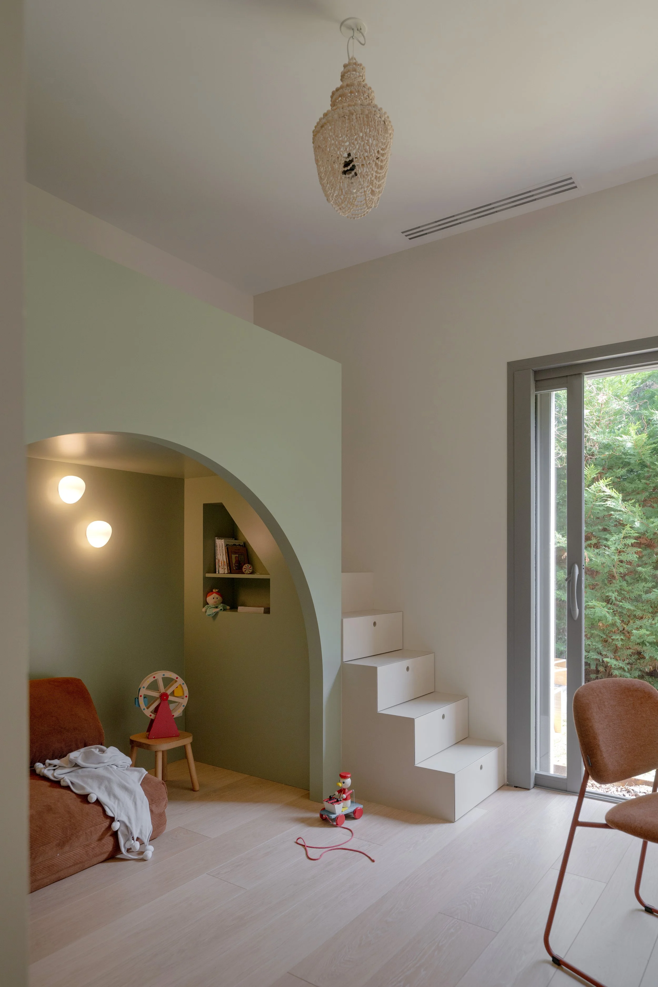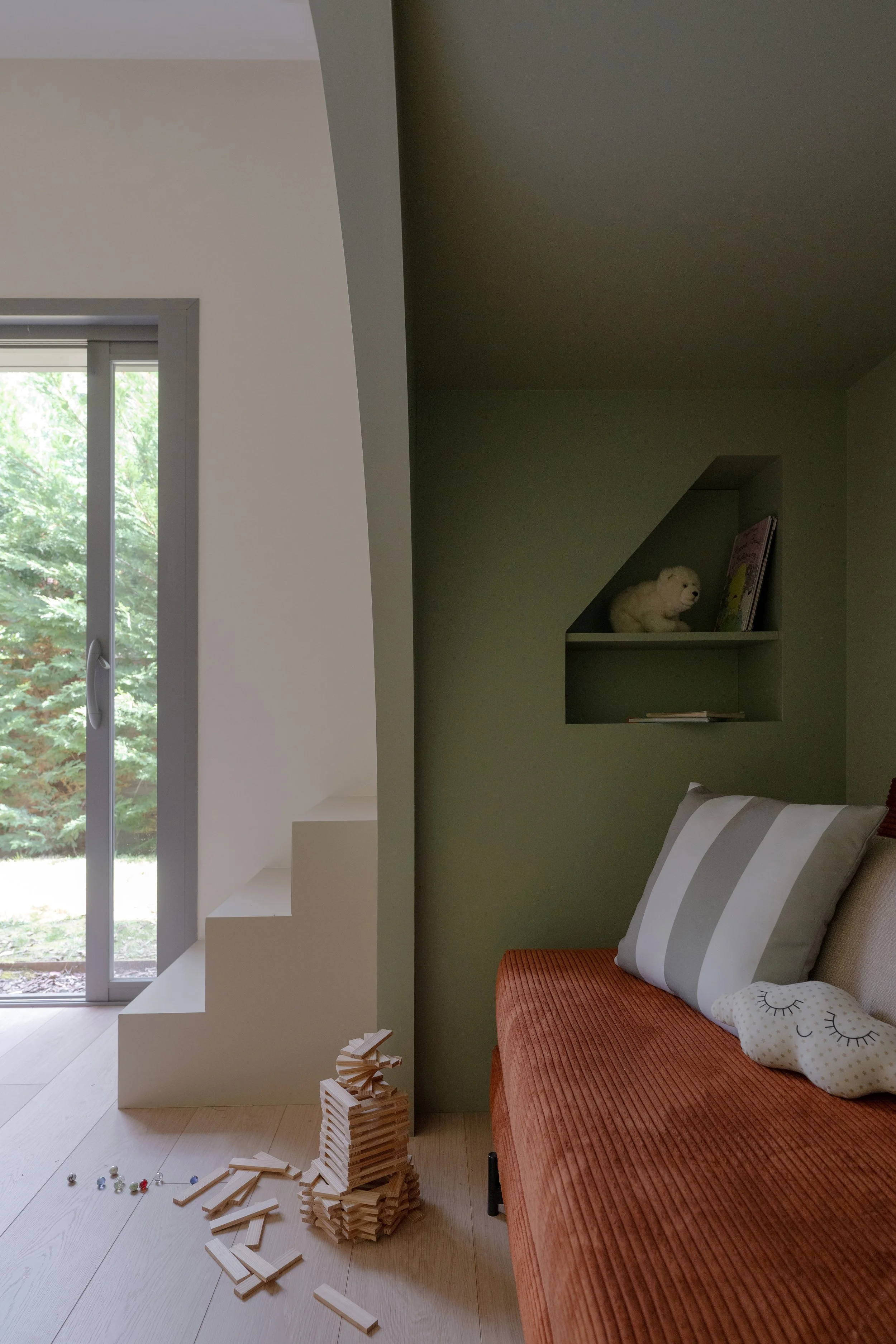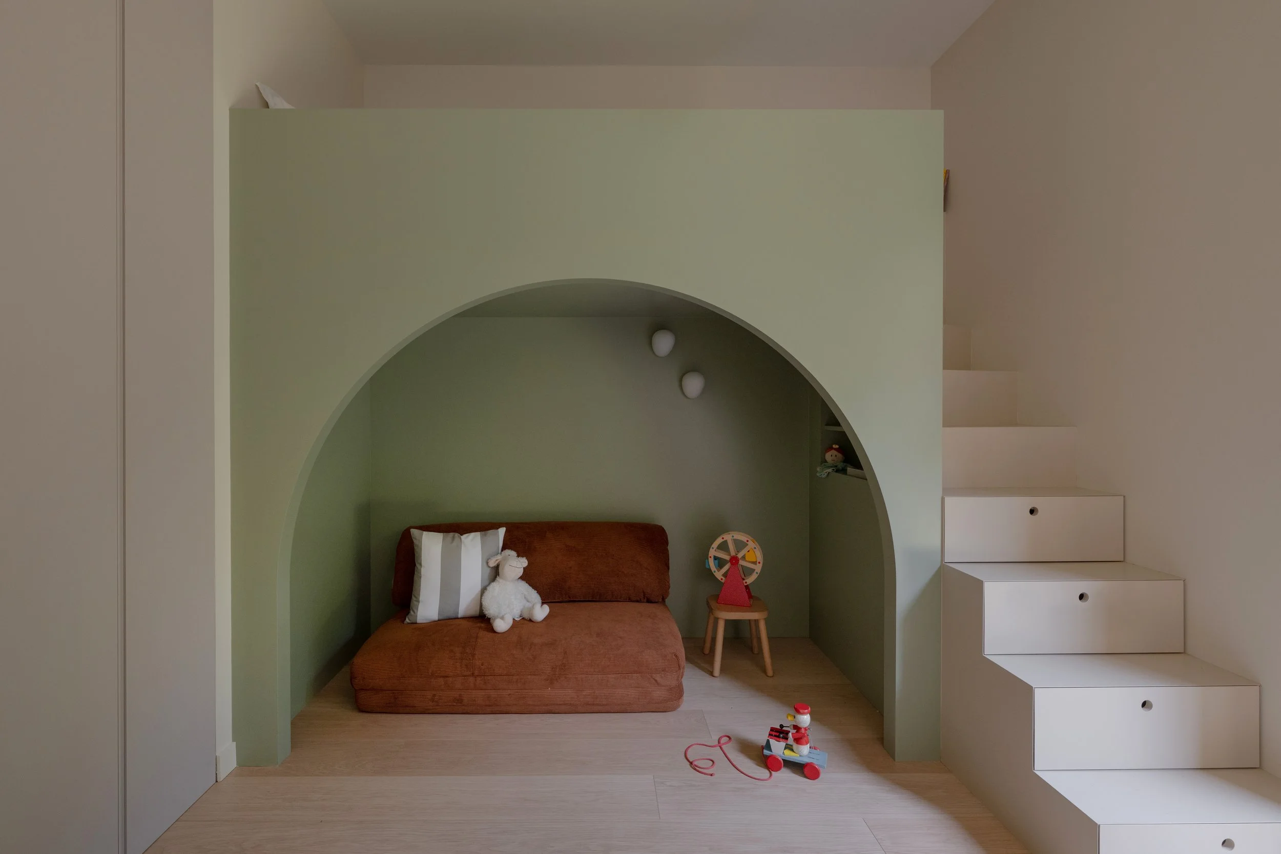 Pour créer le même aménagement dans deux pièces aux géométries différentes, l'une des chambres nécessitait une redistribution complète des cloisons. Une partie des rangements existants a migré vers le couloir attenant pour libérer l'espace nécessaire à l'installation de la mezzanine.Le lit a été conçu comme une boîte colorée dans un ton neutre, posée dans la pièce sans s'y fondre — légèrement détachée de l'environnement, presque sculpturale. L'accès n'est pas une échelle — nous avons dessiné un vrai escalier, dont chaque marche est un tiroir de rangement. Une réponse au manque de place autant qu'un geste d'architecture.L'espace sous la mezzanine a fait l'objet de longues discussions. Nous avons finalement choisi de le laisser ouvert, non meublé, laissant aux filles la liberté de l'investir selon leurs âges et leurs envies. Aujourd'hui un canapé, un lit d'appoint pour les nuits entre amies. Demain un bureau, ou autre chose. La chambre grandit avec elles.Le parti pris esthétique était posé dès le départ : ne pas tomber dans les codes enfantins. Ces mezzanines devaient pouvoir convenir à une jeune adulte. Dans dix ans, elles seront toujours bien.La plus grande satisfaction dans un projet pour des enfants, c'est leur réaction à la livraison. Ils sont les critiques les plus honnêtes qui soient — sans filtre, sans ménagement. Ici, elles se sont approprié l'espace immédiatement. Elles dorment chacune dans leur chambre. Et de temps en temps, l'une rejoint l'autre sous la mezzanine.C'est exactement ce qu'on espérait.Crédits photo — © Sabine Serrad
